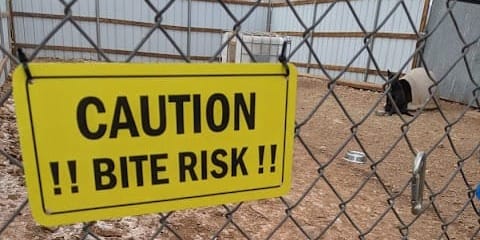 Behind a cautionary “Bite Risk” sign, tucked back in a doghouse 30 feet away, there were two black ears and a long, intimidating snout sticking out to cast an air of intensity that I immediately understood. No happy dog here. No greetings begging to be petted.